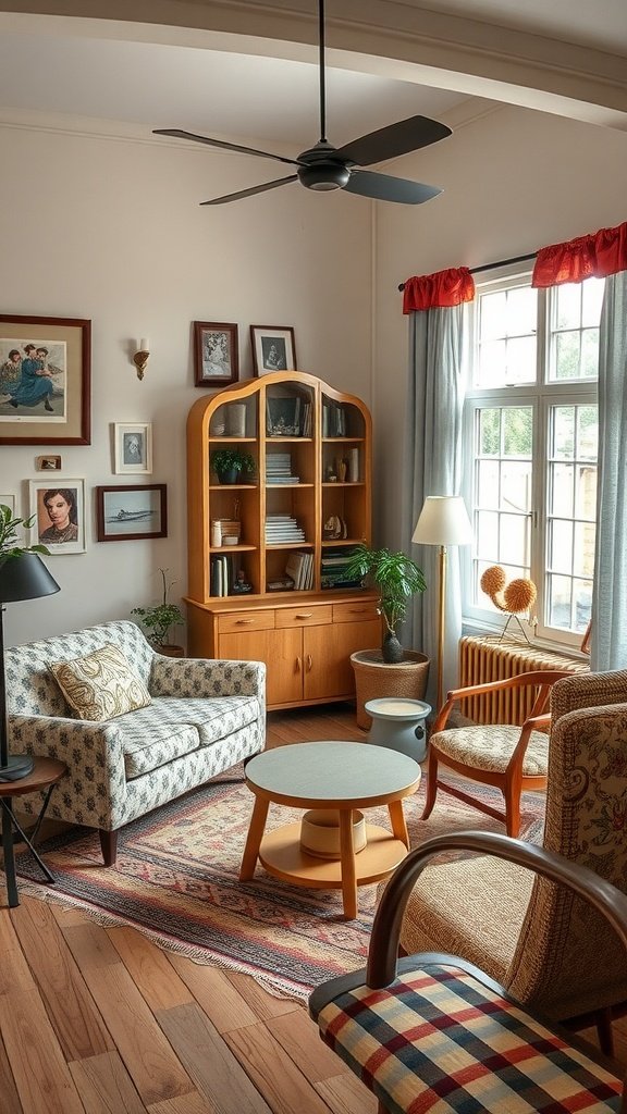 This living room captures a delightful mix of vintage charm and retro style. The cozy seating invites you to relax and enjoy a good book or a chat with friends. The floral-patterned couch and the plaid chair bring a sense of nostalgia, making the space feel warm and welcoming.