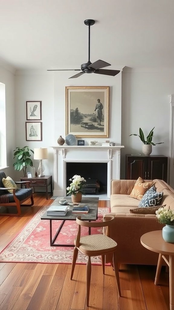 The warm tones of the wooden floor enhance the vintage vibe while the modern coffee table adds a sleek touch. The vintage artwork over the fireplace serves as a focal point, grounding the room in a classic aesthetic.